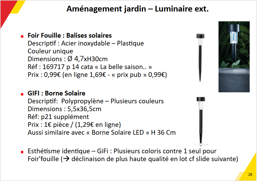 Une partie de mon travail s’est également concentrée sur l’identification de produits innovants qui pourraient enrichir l’offre de GiFi. Par exemple, les luminaires solaires et tonnelles bioclimatiques ont été sélectionnés pour répondre aux attentes des consommateurs en quête de solutions modernes et durables. Ces articles, bien que testés en magasin, illustraient l’ambition de la marque à se positionner sur des gammes premium tout en restant accessible.