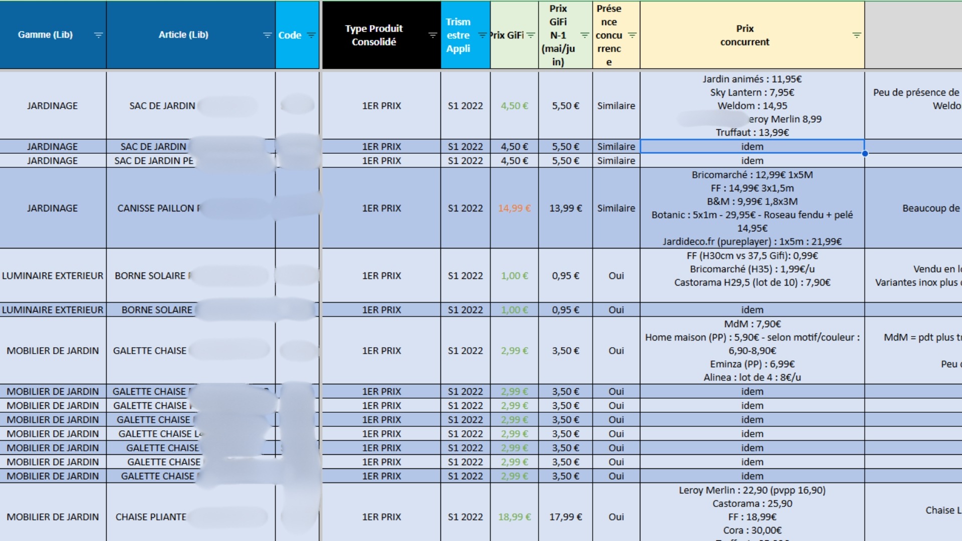 J’ai réalisé une analyse comparative sur les principaux acteurs du marché (Foir’Fouille, Hespéride, Leroy Merlin, Jardiland, et d’autres) pour environ 150 produits. Cette étude s’est concentrée sur :